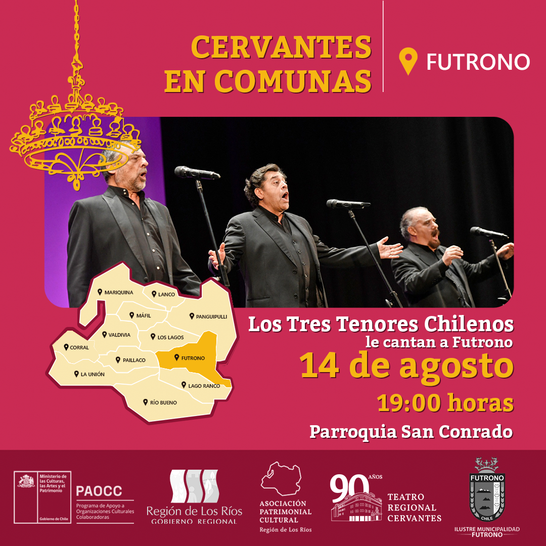Lugar: Parroquia San Conrado de Futrono Fecha: 14 de agosto Hora: 19:00 hrs. Entrada: Liberada En el maco del Programa Cervantes en Comunas, llega a la comuna de Corral el concierto de Los Tres Tenores. Gonzalo Tomckowiack, José Azócar y Leonardo Pohl conforman un trío de tenores que ha sabido combinar virtuosismo, técnica y cercanía con el público en cada