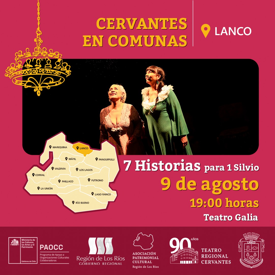 Lugar: Teatro Galia de Lanco Fecha: 9 de agosto Hora: 19:00 hrs Entrada: Liberada En el maco del Programa Cervantes en Comunas, llega a la comuna de Lanco la destacada obra de teatro 7 Historias para 1 Silvio. Dos mujeres se encuentran en escena para compartir un viaje íntimo por la memoria, el presente y el sentido profundo de la