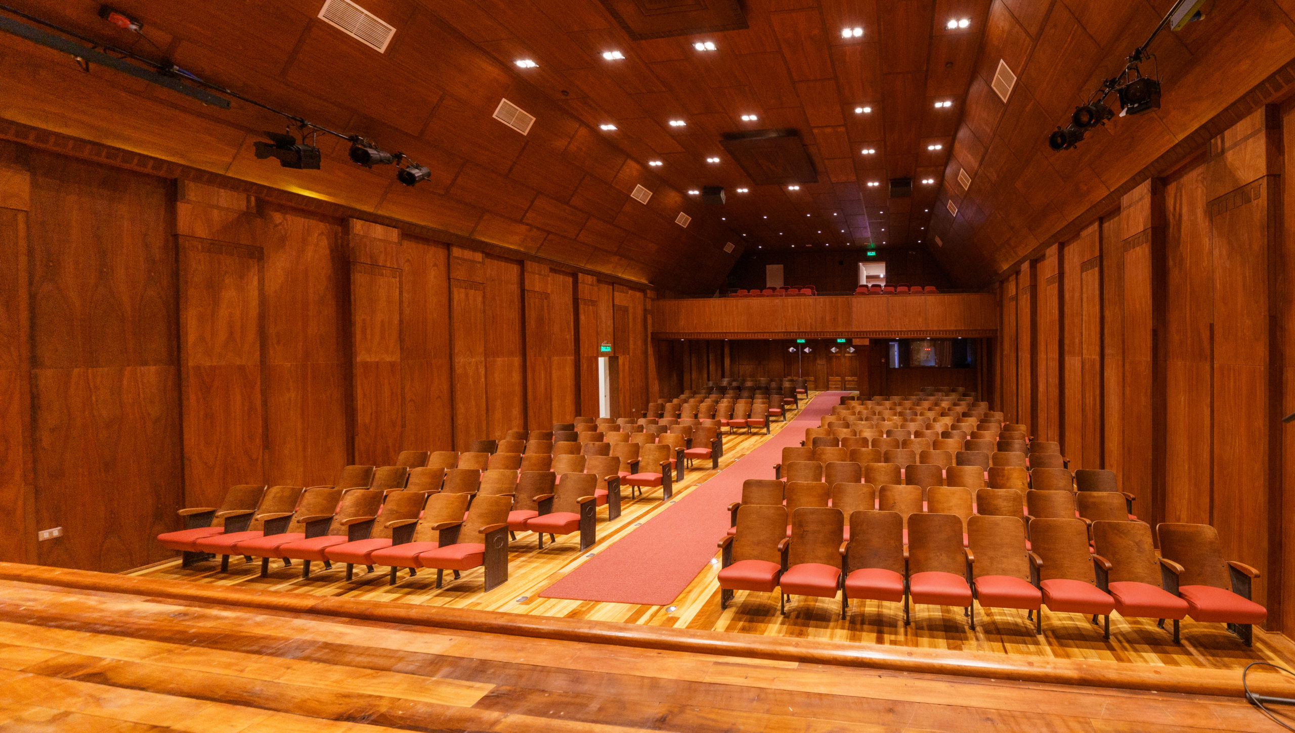 El remozado teatro cuenta con dos niveles de butacas y una capacidad para 241 espectadores. Espacios para oficinas administrativas y la pronta implementación de una cafetería.