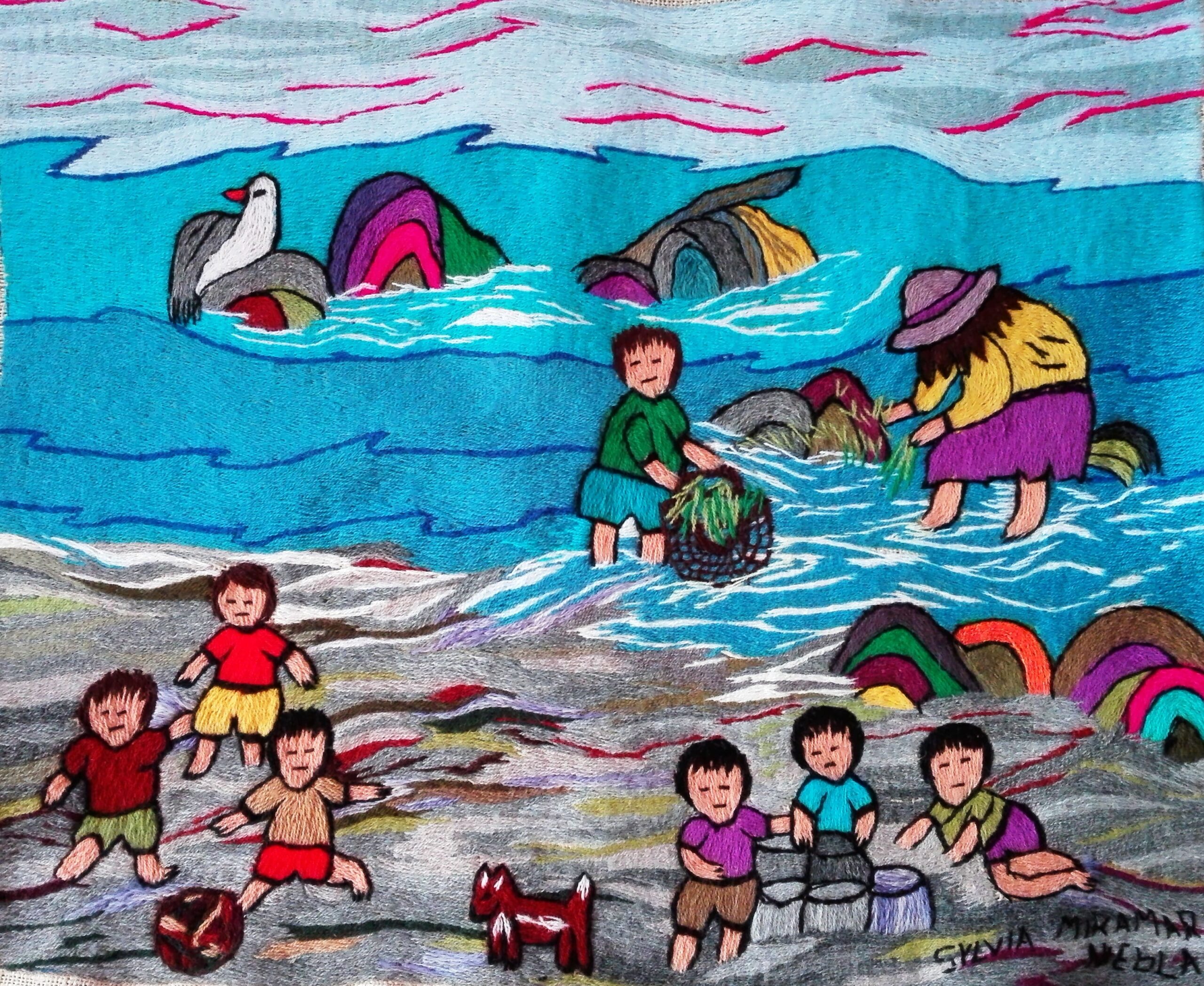 Patricia Matus tiene 45 años y es recolectora de orilla, más específicamente de la cosecha del cochayuyo (alga de color parda comestible), oficio que lo complementa con su rol de dirigente social en la Asociación Indígena Rayen Lafken. “Trabajamos por temporada, mayormente desde los meses de diciembre a marzo si el tiempo lo posibilita. Mi marido es el que corta el cochayuyo y luego lo tiende, después lo lavamos para amarillar, se pica y se vende en bolsitas de 200 gramos. Entregamos al por mayor para exportaciones en temporada de verano y también vendemos en el invierno.” Patricia dice gustarle mucho su trabajo, aunque reconoce que puede llegar a ser muy sacrificado: “esto es ladera y los chicos tienen que subir el cochayuyo en fardos. Se torna complejo porque son subidas ancestrales”, menciona.