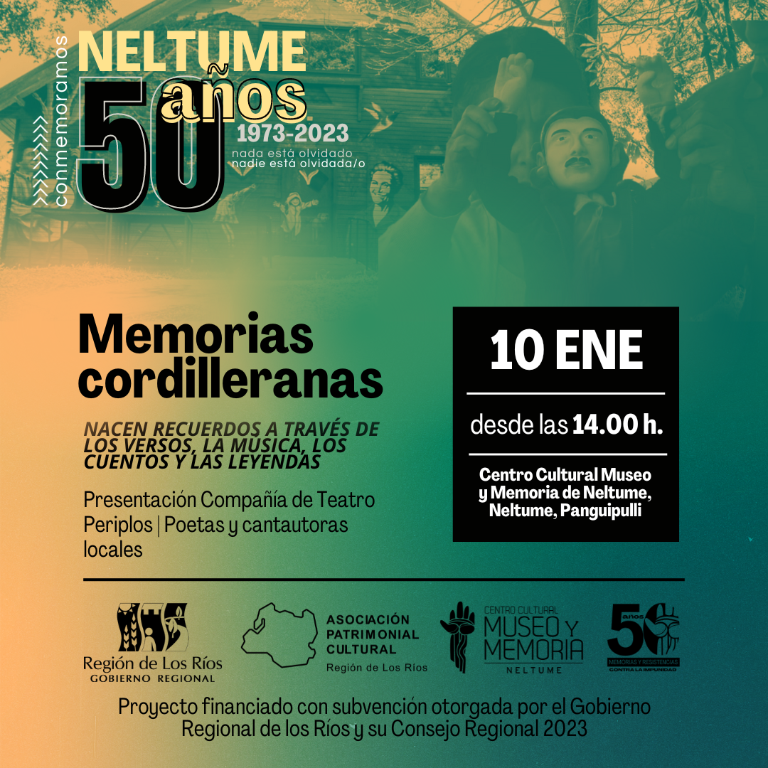 Para el 10 de enero se vivirá una jornada artística donde se presentarán poetas, cantautores y figuras respetadas de la comunidad de Neltume en el museo de dicha localidad a partir de las 14:30 horas. Angélica Navarrete, presidenta del Centro Cultural Museo y Memoria de Neltume y encargada de extensión del museo indicó: “esta una actividad que nos convoca, con un enfoque cultural de memoria a través de poesía, teatro y música. Con la APC tenemos un convenio de colaboración, y han sido un respaldo importante para realizar estas actividades, que esperamos se pueden repetir en un futuro”. El programa lo puedes revisar acá.