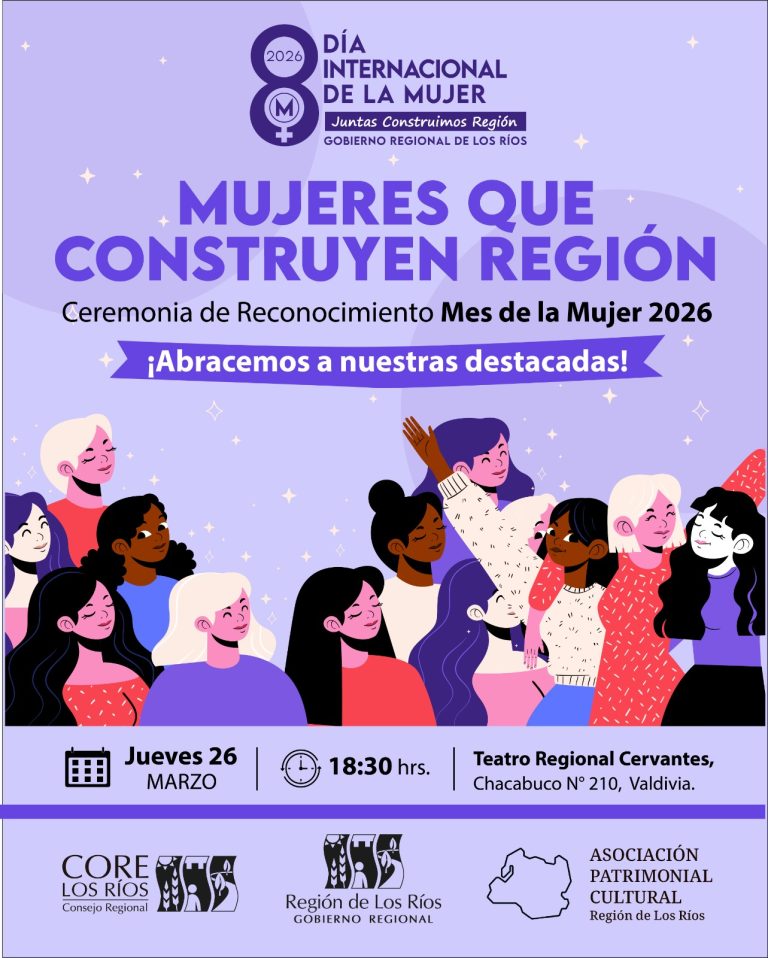 En el marco de la conmemoración del Mes de la Mujer, el Gobierno Regional de Los Ríos, junto al Consejo Regional de Los Ríos, la Asociación Patrimonial Cultural, en colaboración con el Ministerio de la Mujer y Equidad de Género, invitan a toda la comunidad a ser parte de la ceremonia “Mujeres que Construyen Región”, una emotiva instancia, que pondrá en valor a mujeres excepcionales cuyo liderazgo, esfuerzo y compromiso son un aporte al desarrollo de los territorios.