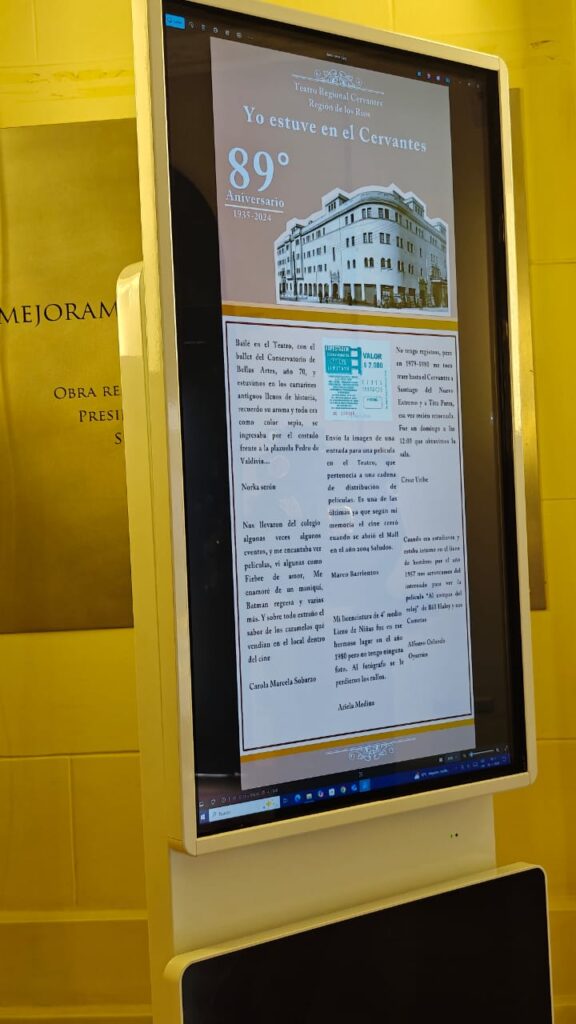 El encargado de Extensión de la APC, Ricardo Núñez, enfatizó: “invitamos a la comunidad valdiviana a que se acerque al hall del Teatro Regional Cervantes donde podrá empaparse de la historia antigua del Cervantes, en el marco de los 89 años de vida. Además, conocer de manera digital testimonios de personas que estuvieron en el antiguo Cine Cervantes y que reflejan su rica historia que se sigue expandiendo”.