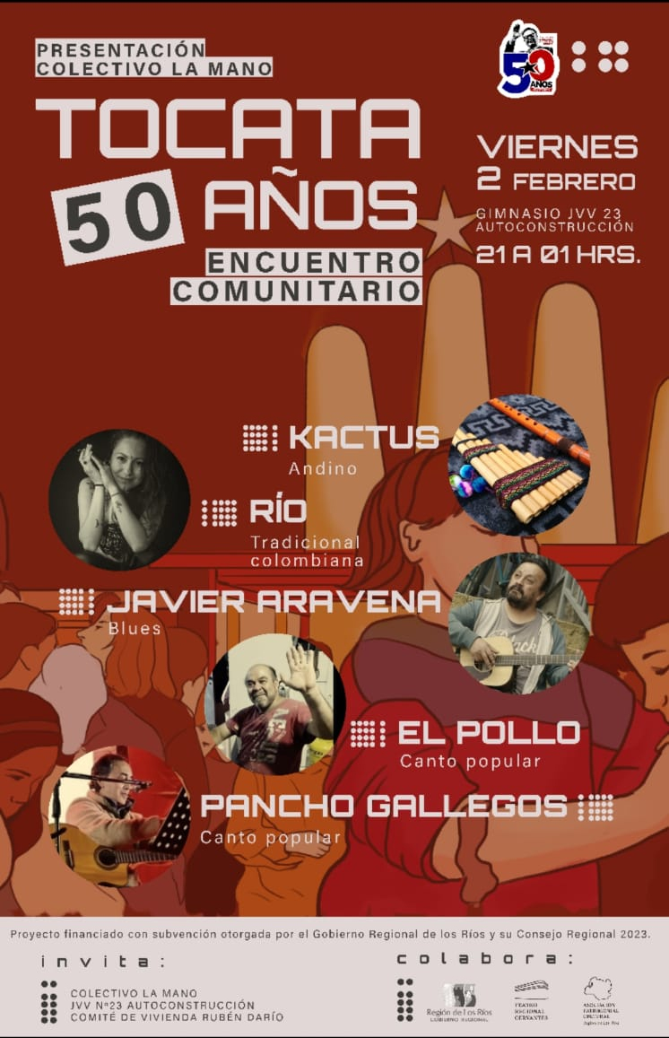 La actividad, denominada “Encuentro Comunitario 50 años”, consta de una tocata abierta a la comunidad en conmemoración de los 50 años de la dictadura que se realizará en gimnasio de “La Mano”, ubicado en calle Rubén Darío este viernes 2 de febrero de 21:00 a 1:00 hrs.