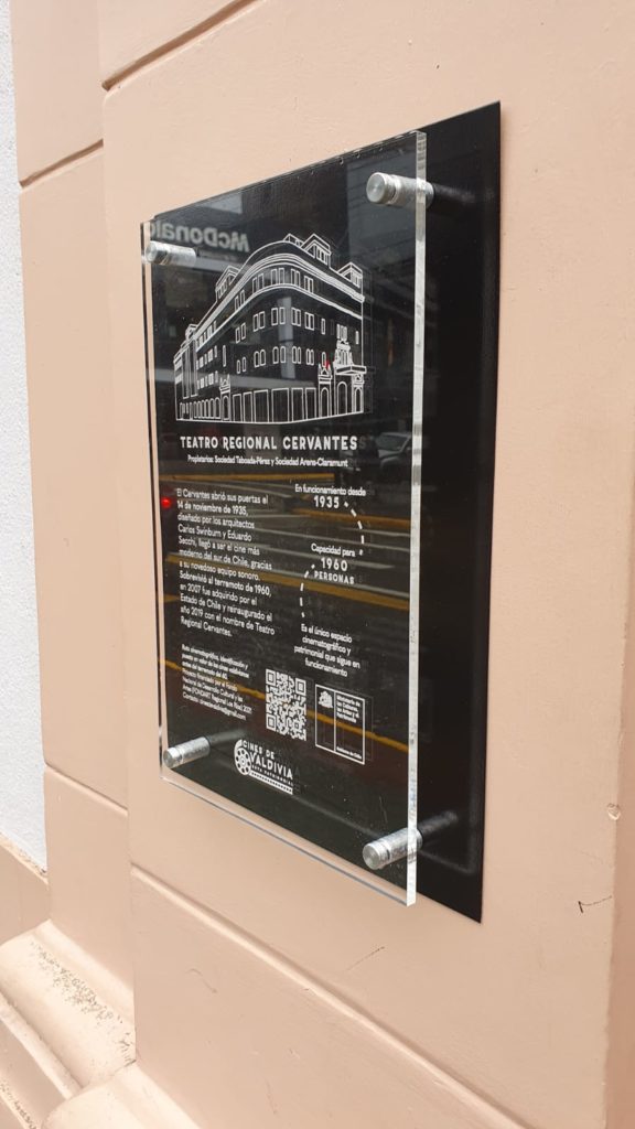 Placa instalada al exterior del Teatro Regional Cervantes que da cuenta de las Rutas Patrimoniales de los cines valdivianos.