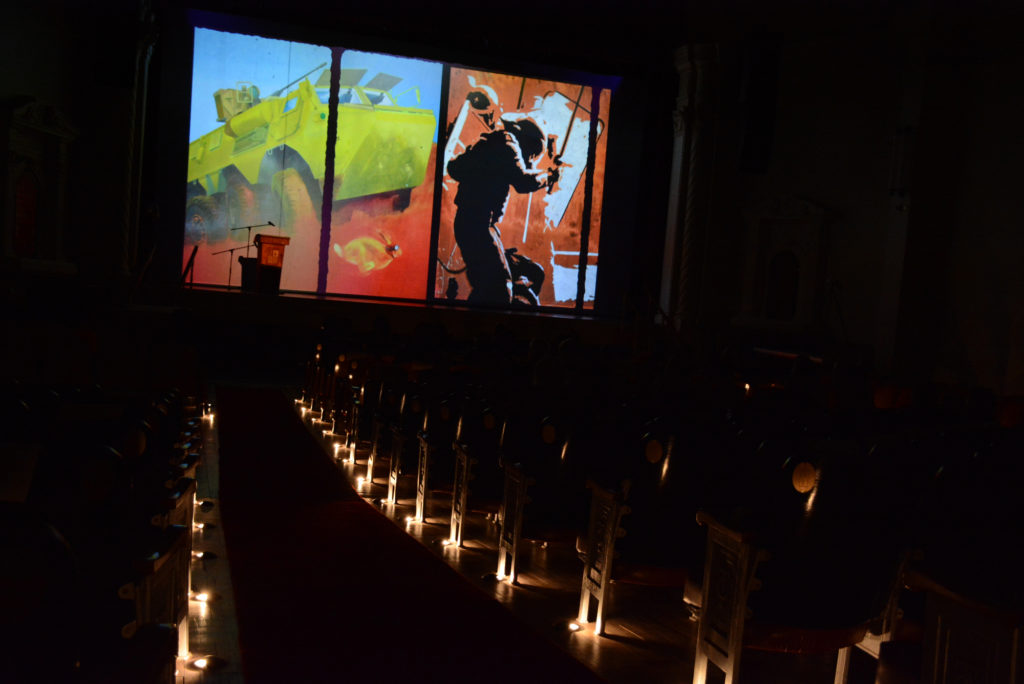 El evento finalizó con la puesta en escena de uno de los cuadros más reconocidos de Miranda, que se desplegó en medio del escenario, dando cuenta de la importante presencia de este artista valdiviano que durante más de una década luchó por la descentralización del arte en el país y el sueño de contar con un museo de arte contemporáneo con los más altos estándares de conservación y exhibición.